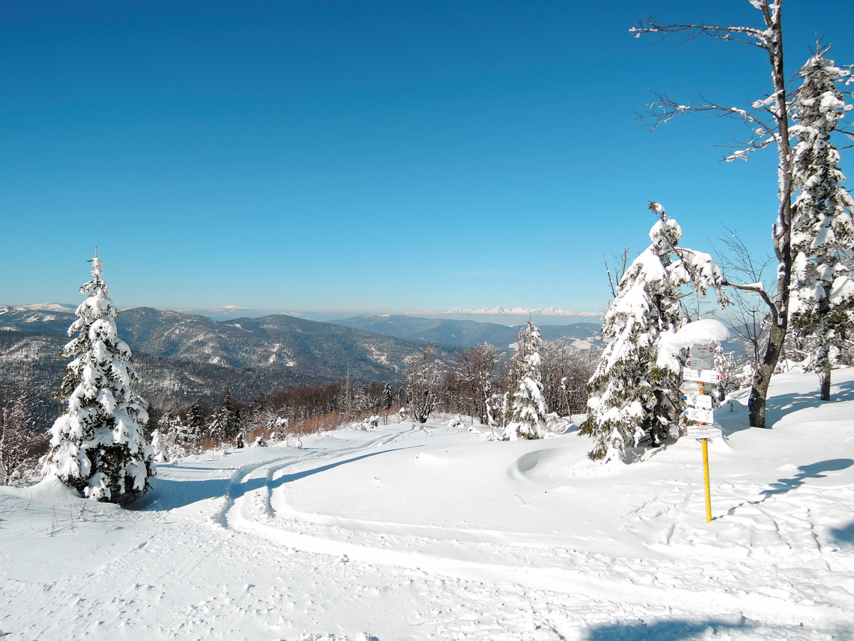 Uvažujem, či pokračovať po obľúbenej príjemnej trase ďalej na západ do sedla Trohanka. Odtiaľ by sa dalo pokračovať až na Kloptaň s vyhliadkovou vežou, ale úsek za Trohankou je náročnejší kvôli terénu a častým polomom. Nakoniec sa rozhodnem vychutnať si upravené bežecké trasy a v pohode sa vrátiť naspäť k autu. Pri rázcestníku Spálenica odbočuje doprava zelená turistická značka. Chodievam ňou sem na hrebeň zväčša len hore na lyžiach, pretože pre pár strmších úsekov je táto trasa na zostup menej vhodná.