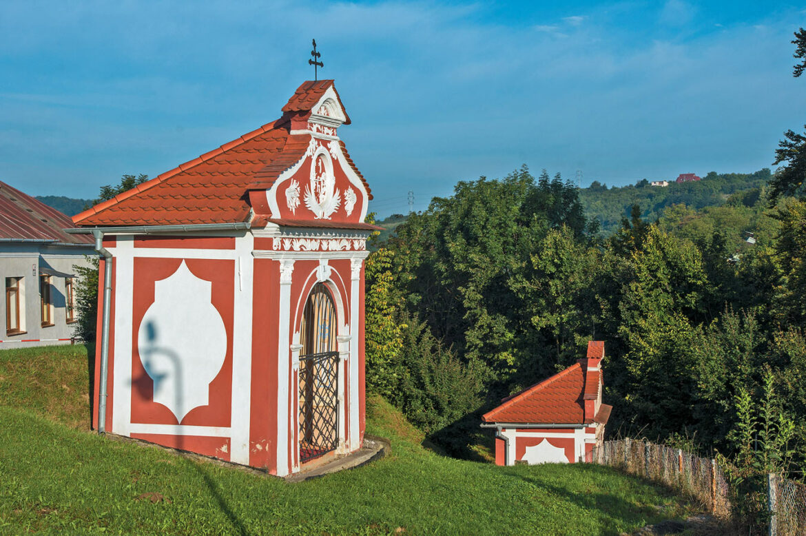 Kostol Svätého kríža a kamenný kríž s výjavom ukrižovaného Krista